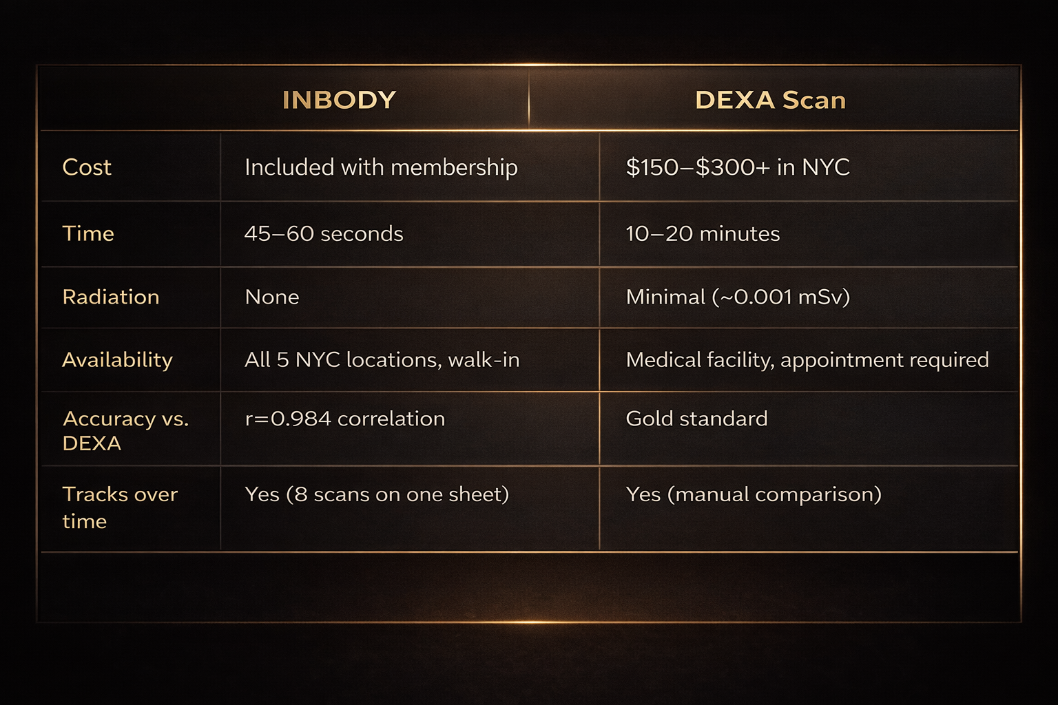 For gym-goers in NYC, InBody is the practical choice: it's faster, more accessible, and just as accurate for tracking fitness progress over time. Research published in PubMed found that InBody BIA technology correlates with DEXA at r=0.984 (PubMed, 2018). That's a near-perfect correlation, which means the data you get from an InBody scan is highly reliable for the purpose most gym-goers have: tracking change.